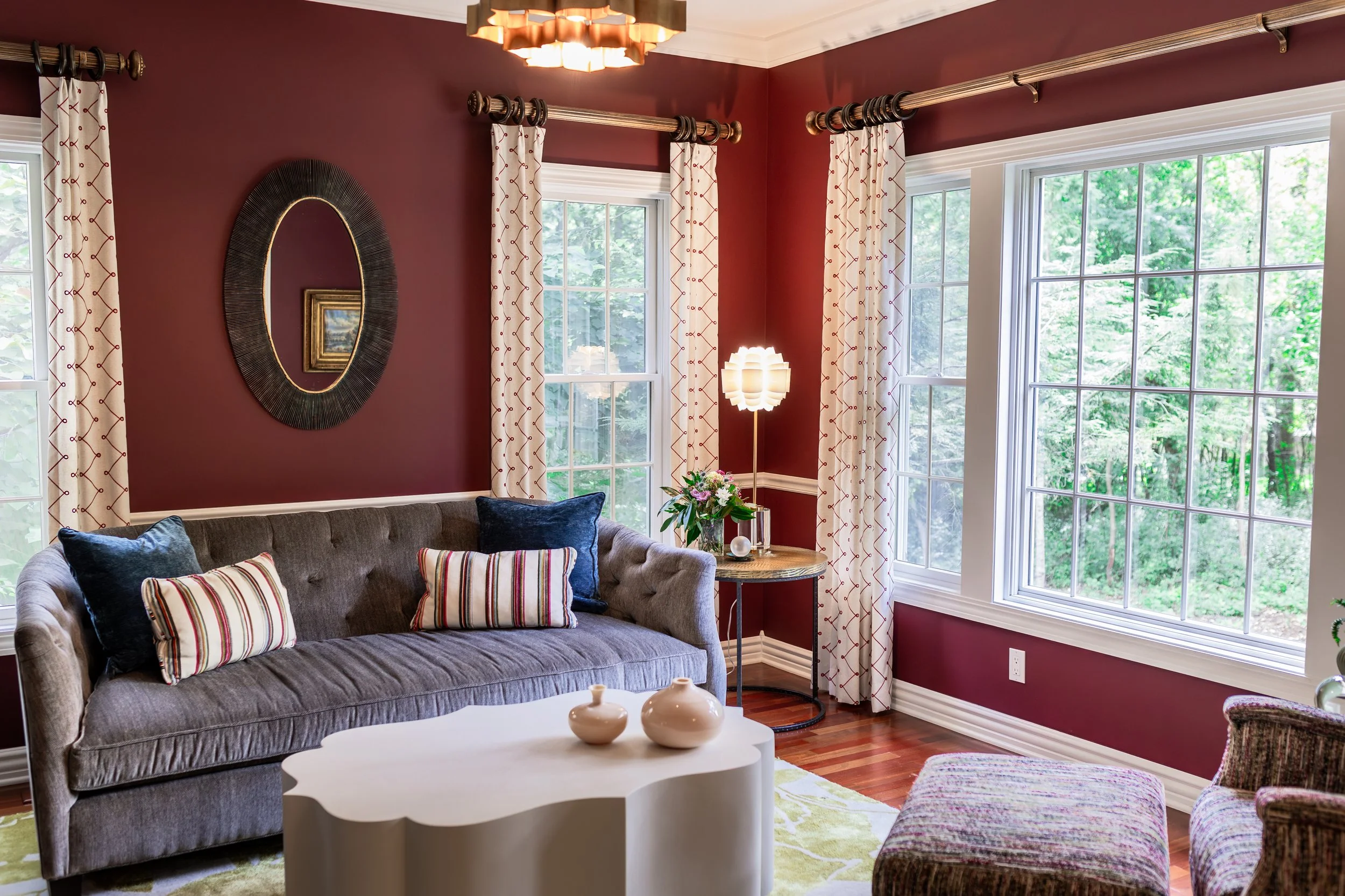 The sitting room features a curated design with a rich color palette accented by deep burgundy walls. The room is furnished with a mix of classic and eclectic elements creating a whimsical and inviting atmosphere.